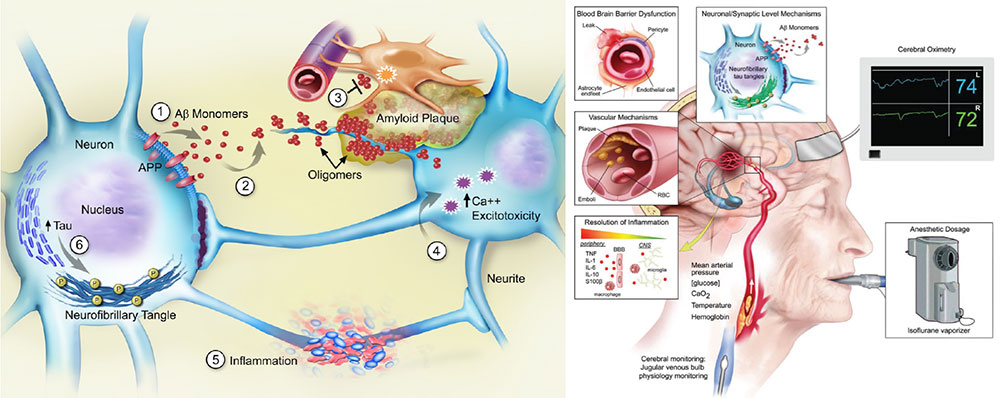 Right: Processes that have been implicated in the Pathophysiology of Perioperative Neurocognitive Disorders. -from Berger M et al, Anesthesiology, 2018